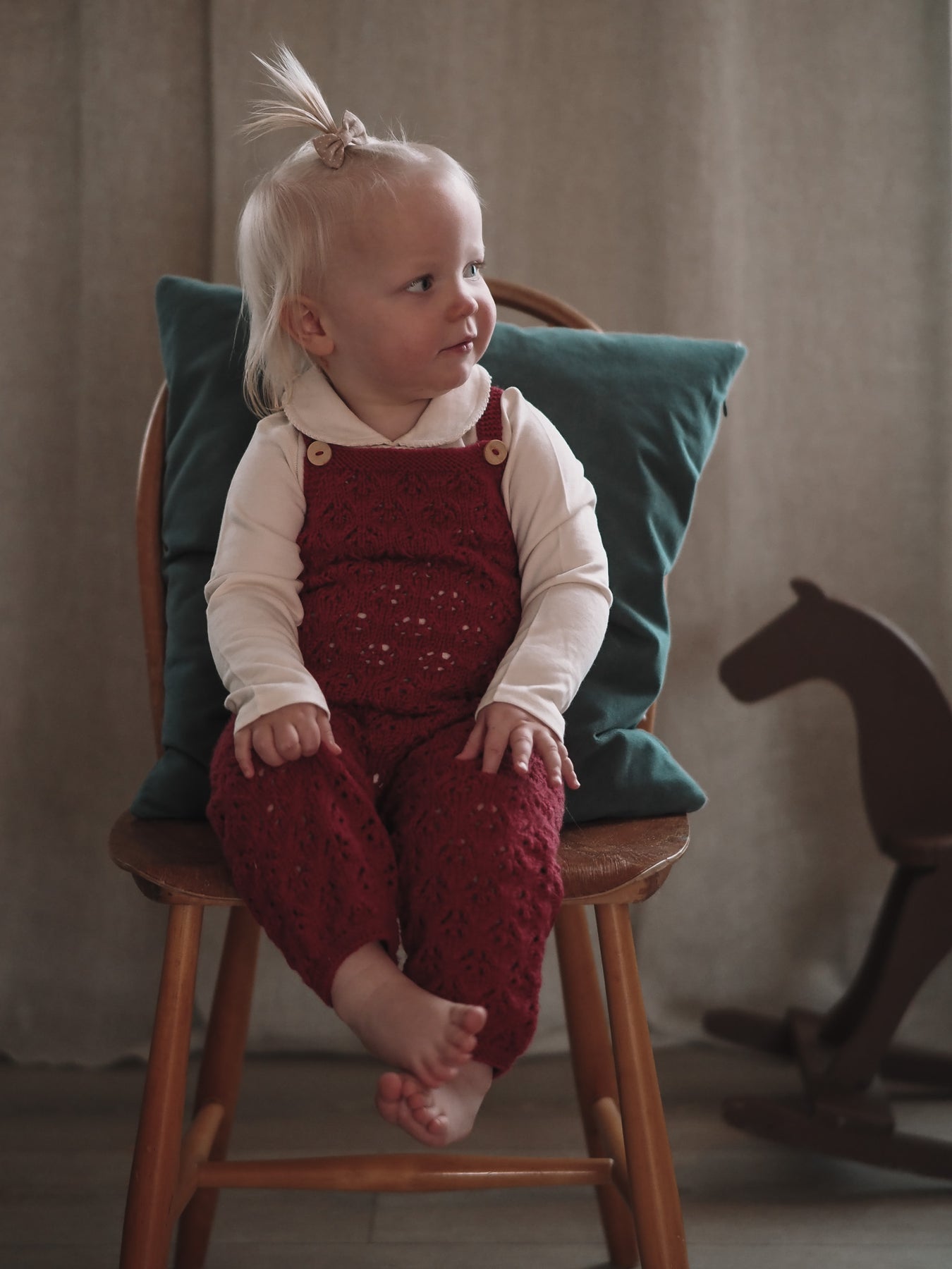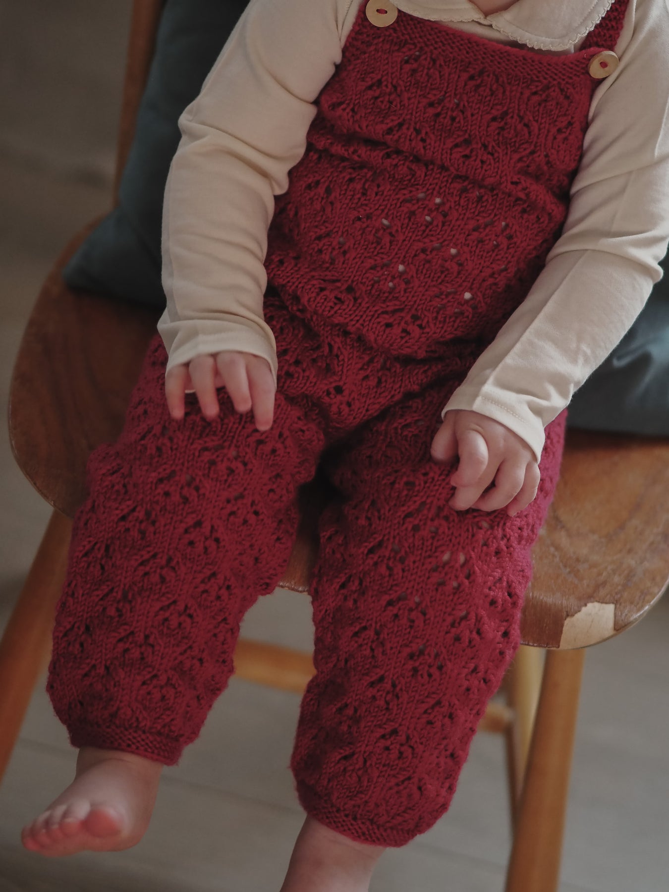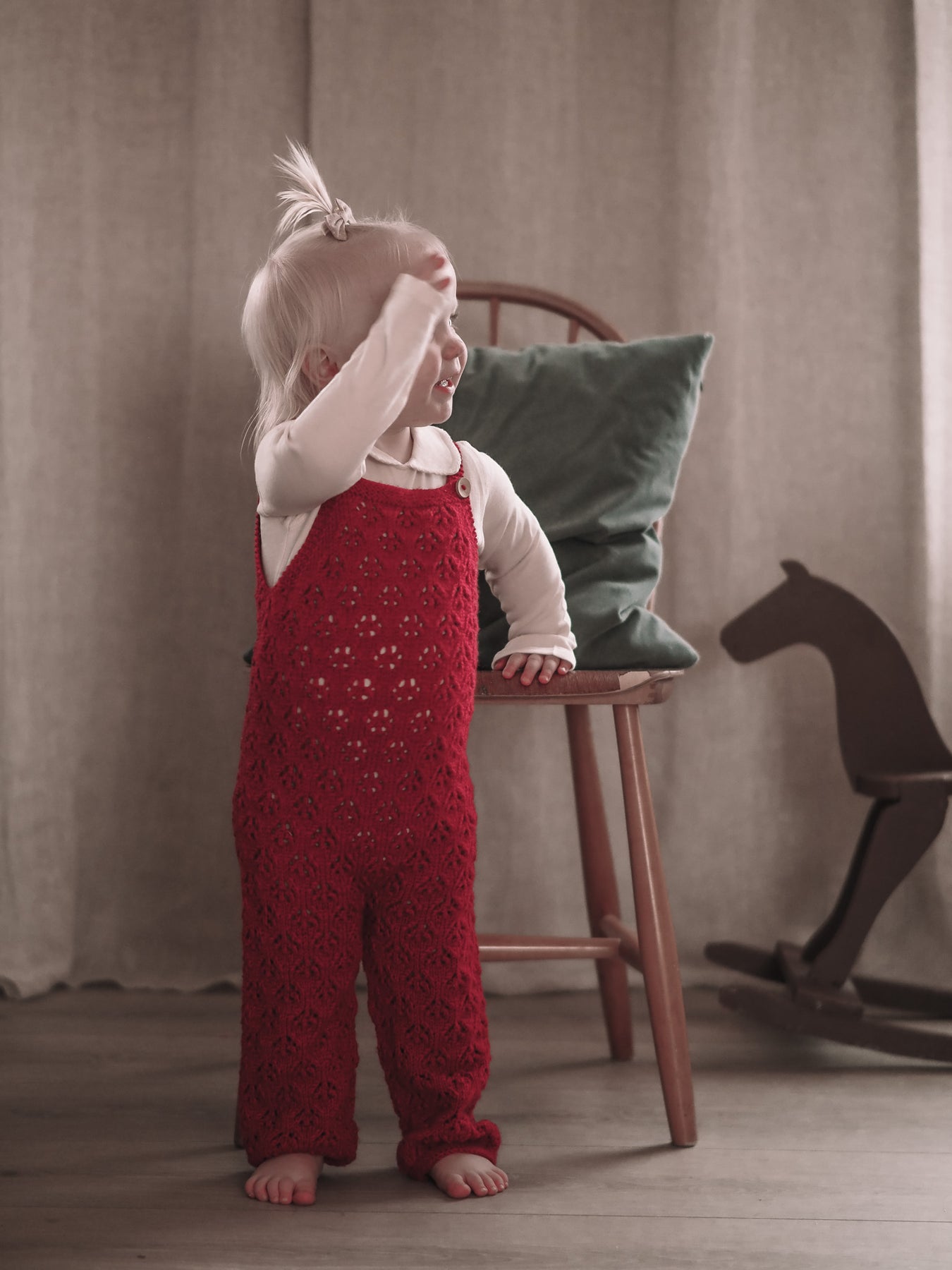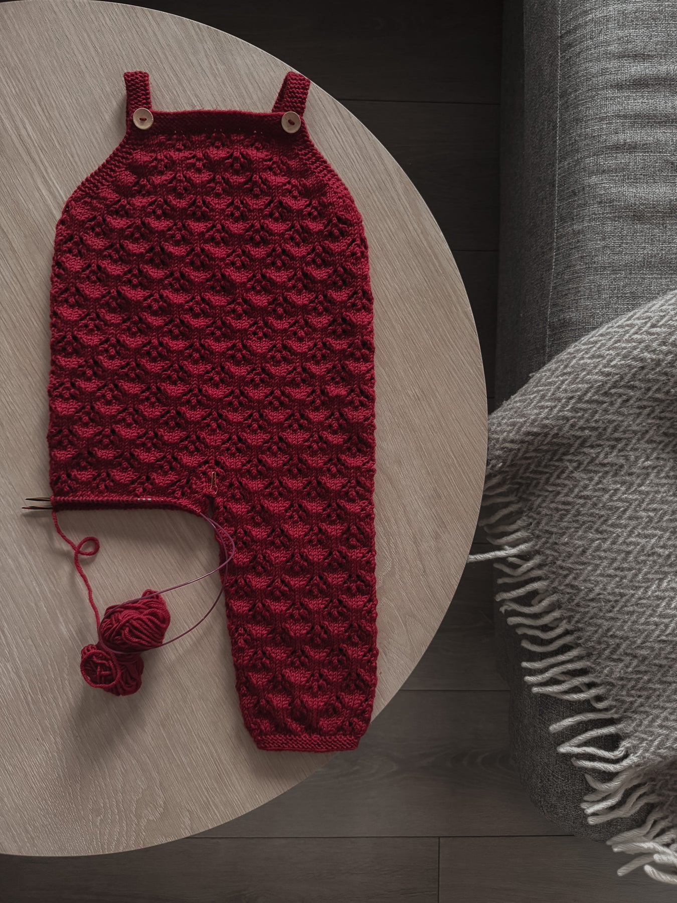 We love the overall in the Pinecone series, but now that my children are growing, it takes more and more time to knit with the thinnest yarn. That’s why I had to create a pair of overalls using a slightly thicker yarn – which also makes them extra warm and cosy for winter wear.